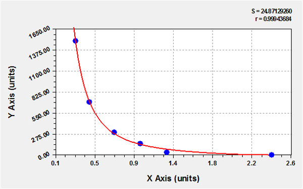 ELISA操作步驟復(fù)雜,影響反應(yīng)因素較多,特別是固相載體的包被難達(dá)到各個(gè)體之間的一致,因此在定量測(cè)定中,每批測(cè)試均須用 一系列不同濃度的參考標(biāo)準(zhǔn)品在相同的條件下制作標(biāo)準(zhǔn)曲線。測(cè)定大分子量物質(zhì)的夾心法ELISA,標(biāo)準(zhǔn)曲線的范圍一般較寬, 曲線最高點(diǎn)的吸光度可接近2.0,繪制時(shí)常用半對(duì)數(shù)值,以檢測(cè)物的濃度為橫坐標(biāo),以吸光度為縱坐標(biāo),將各濃度的值逐點(diǎn)連接, 所得曲線一般呈S形,其頭、尾部曲線趨于平坦,中央較呈直線的部分是最理想的檢測(cè)區(qū)域。測(cè)定小分子量物質(zhì)常用競(jìng)爭(zhēng)法, 其標(biāo)準(zhǔn)曲線中吸光度與受檢物質(zhì)的濃度呈負(fù)相關(guān)。標(biāo)準(zhǔn)曲線的形狀因試劑盒所用模式的差別而略有不同。ELISA測(cè)定的標(biāo)準(zhǔn)曲線注意圖中 橫坐標(biāo)為對(duì)數(shù)關(guān)系,這更有利于測(cè)定系統(tǒng)的表達(dá)。
